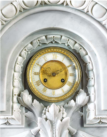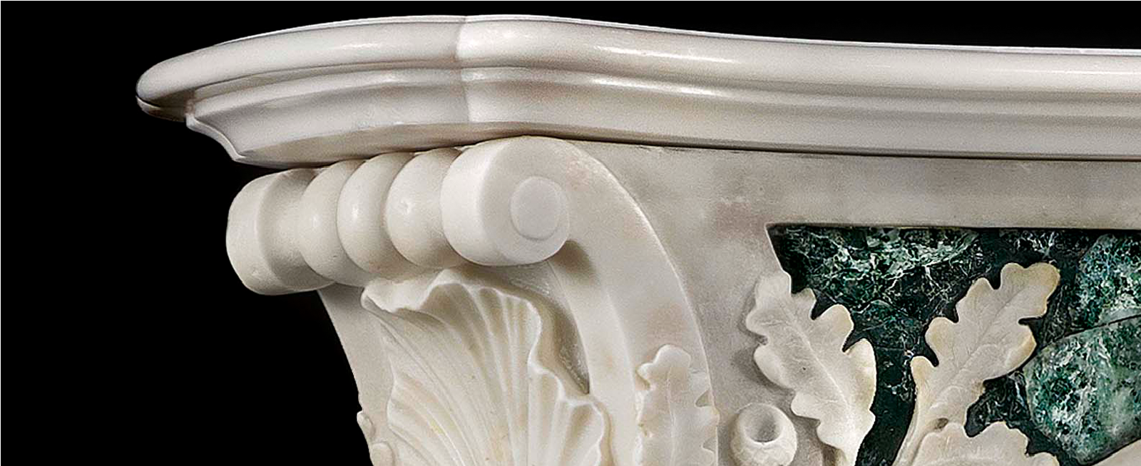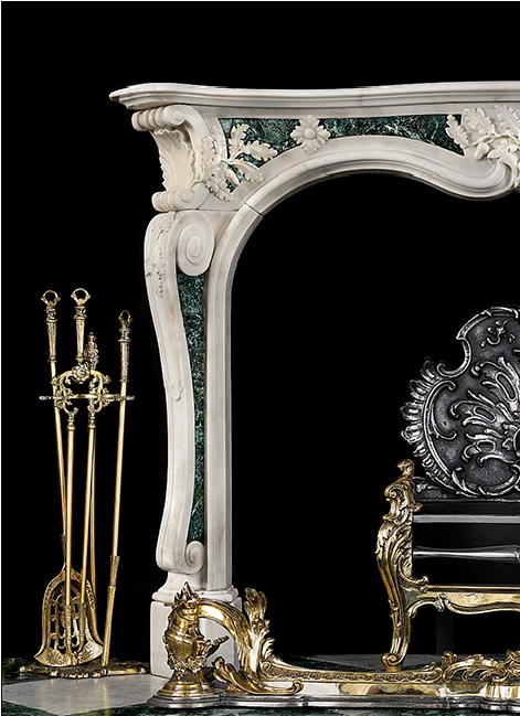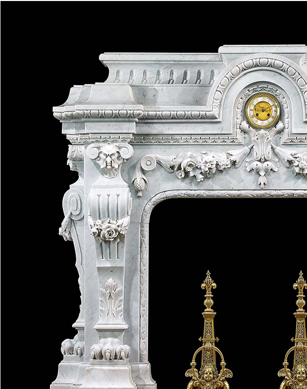 这款大型烟囱在石榴石色的 蛇纹石大理石中装有双柱门框, 支撑着朗格多克大理石架子。